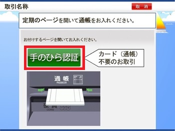 5. 通帳挿入画面で「手のひら認証」を選択してください。