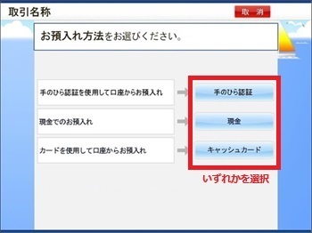 4. お預入れ方法として「手のひら認証」「現金」「キャッシュカード」のうちから選択してください。