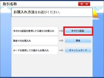 4. お預入れ方法として「手のひら認証」を選択してください。