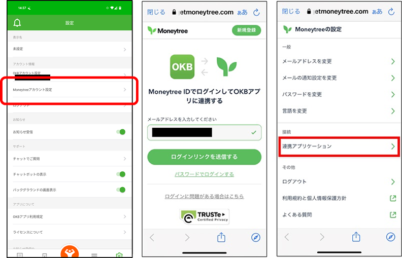 3.連携しているサービスの中から、OKBアプリの「連携を解除」ボタンをタップし、「OK」をタップすると、Moneytreeとの連携が解除され、引き続きOKBアプリをご利用いただけます。