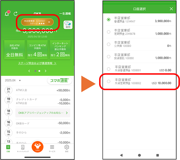 なお、外貨残高や評価円価額を確認することができるOKBの外貨預金は、OKBアプリ(OKBアカウント)に登録済みの普通預金(総合口座を含みます)と、同じ店番・同じCIF(お客さま番号)である必要があります。