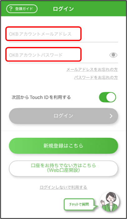 OKBアプリのログイン画面で、メールアドレスとパスワードを入力し、ログインをタップする